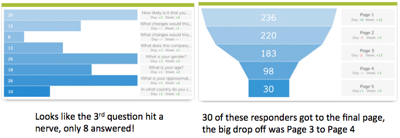 You’ll also want to assess where your responders dropped off the survey if there were multiple pages or which question they hit and stopped. In the example above this company might check out what’s going on between page 3 of the survey to page 4, they may be asking too many questions and turning responders off.