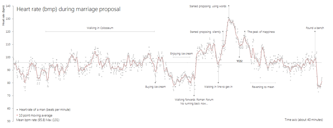 We always head over to Flowing Data to see what cool new data visualizations they’ve come up with or surfaced. This one is priceless. A Reddit user tracked his heart rate before and after his proposal while in Italy for 40 minutes. Wearing a heart rate belt you can see how he freaked out during the day and during the proposal, then calmed down and sat on a bench.