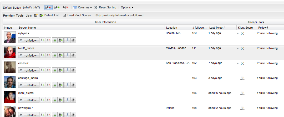 Tweepi basically looks at who you’re following and who is following you, gives you all the info you need like how many followers they have, the last time they Tweeted, their Klout score, and all of the things you need to sort on so you can decide whether to unfollow them or not.